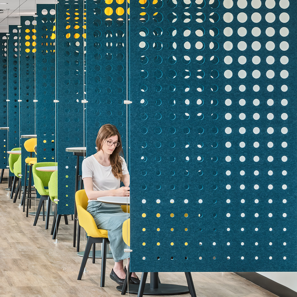Quantum corporate headquarters is everything they hoped for and more. The team at BHDP understood how to create a supportive environment from the vibrant amenity hub and always-within-reach coffee bar to private sanctuary rooms on every floor. Our Goccio Divider Panels bring a sense of calm and clarity to the space, defining areas while enhancing acoustic comfort throughout the workplace. From day one, employees are welcomed with excitement and inspiration, ready to make their mark and proudly join an important healthcare team.
